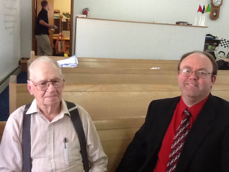 July 16, 2012Tom was the speaker at a church in Pocahontas, IA yesterday and two souls made commitments accepting Jesus Christ as their savior. One of them was 89 years of age, Vernon (pictured with Pastor Tim) . When asked what brought him to church that day, he said it was the sign on [Tom and Carolyn’s] the motor home. PTL for Vernon and signs!