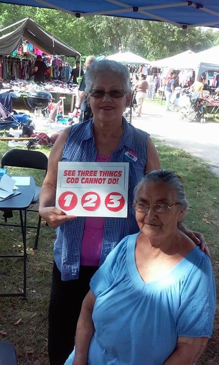 The newest member of the Florida team is Yolanda. Not only does she have a desire to win souls, she is bilingual and is translating SOS Events training materials into Spanish which will be a great tool to enlarge the growing Spanish ministry of SOS. She is a willing worker and will also be a part of Senior Servants who help with the monthly newsletter and tract ministry. Her first event was this week at the Plant City Flea Market where she had the opportunity to see souls come to JESUS. She is the lady on the left holding the small “3Things God Can Not Do” display board. The other lady in the photo is a new convert.