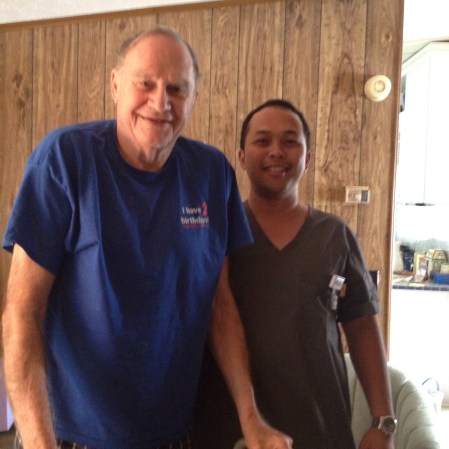 This is a photo of Tom Curtis and Nicky, Tom’s physical therapist. Nicky comes to help Tom recover from his surgery. Yesterday, Nicky asked Jesus to be his Savior.