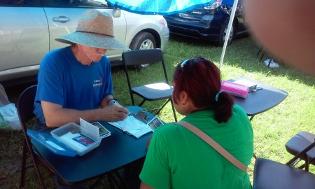 This is a photo from the Plant City Flea Market, yesterday. William, who speaks Spanish, has been unable to be at the flea market for several weeks due to a health problem. He is back now and here he is leading woman to the Lord who only speaks Spanish. Welcome back, William and Praise the Lord for this lady who accepted Jesus. Also, thank the Lord for His healing.