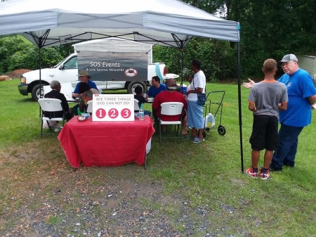 What a great day with SOS Events Ministry at Santuck Flea Market in Alabama on Saturday. All the team members have wonderful stories of lives being changed forever as people surrender their lives to Christ. We were blessed with 26 souls being added to the Kingdom. 475 tracts we’re given out and almost 200 people came before the board to be asked if they knew “3 Things God Can Not Do”. That’s a lot of seeds being planted. A big thank you to Beth, Wes, David, Carl and Patricia for being there and their work Serving Our Savior.