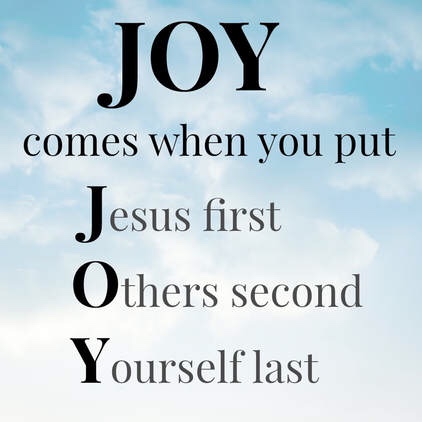 JESUS, OTHERS and YOU. Put Jesus first, others 2nd and yourself last. That is a recipe for true joy in your life.
