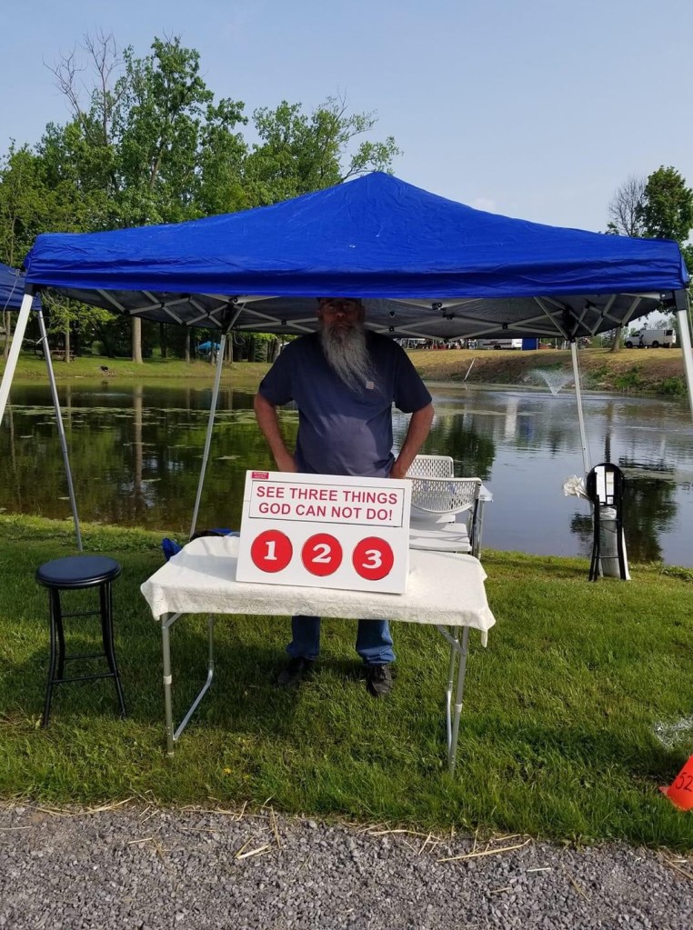 Joe is all set up with an SOS events Display Board, waiting for people to come by and see the 3 Things God Can Not Do.