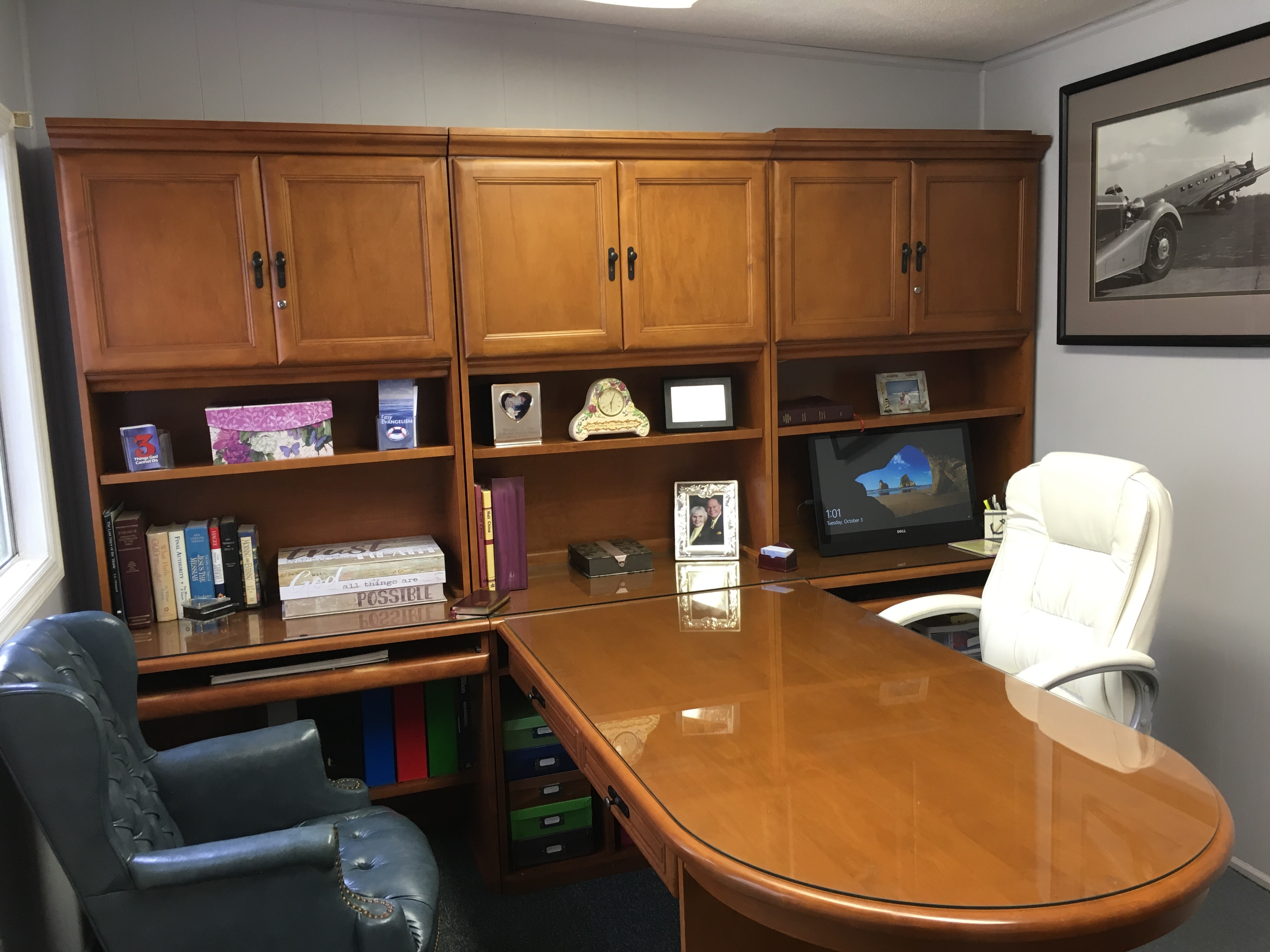 Sometimes problems turn out yo be a great blessing. Carolyn Curtis’s office was filled with mold and mildew from a roof leak after the severe rains. The roof leaked and damage went unnoticed for several weeks because the water was coming into the interior walls and did not show other damage. The roof is now fixed, the mold and mildew gone, everything is like new even the beautiful office furniture (bought on Craig’s list). A nice place to welcome visitors and continue the work that Carolyn does for SOS Events Ministry. God is so good. Praise the Lord for turning this problem into a blessing.
