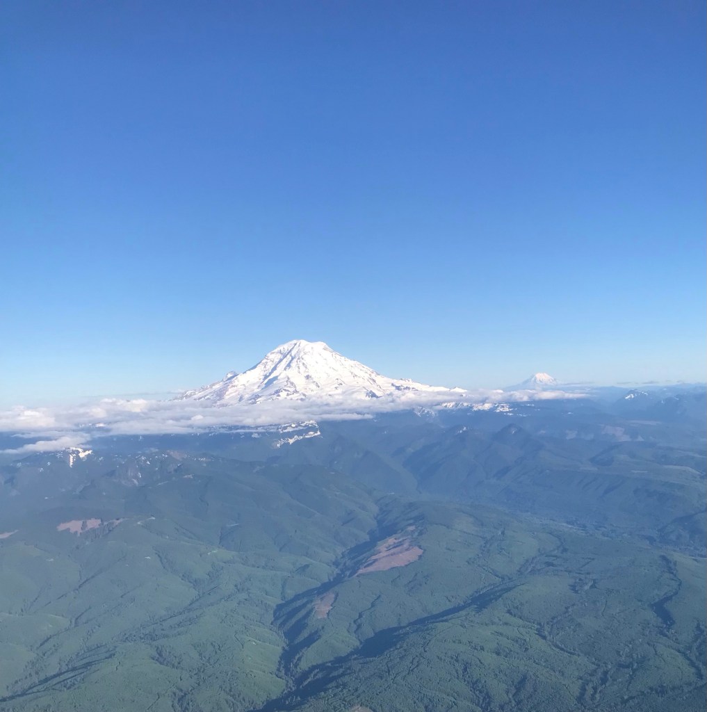 Looking out from an airplane window we see at the beautiful snow covered Mount Rainier. What a sight to behold.