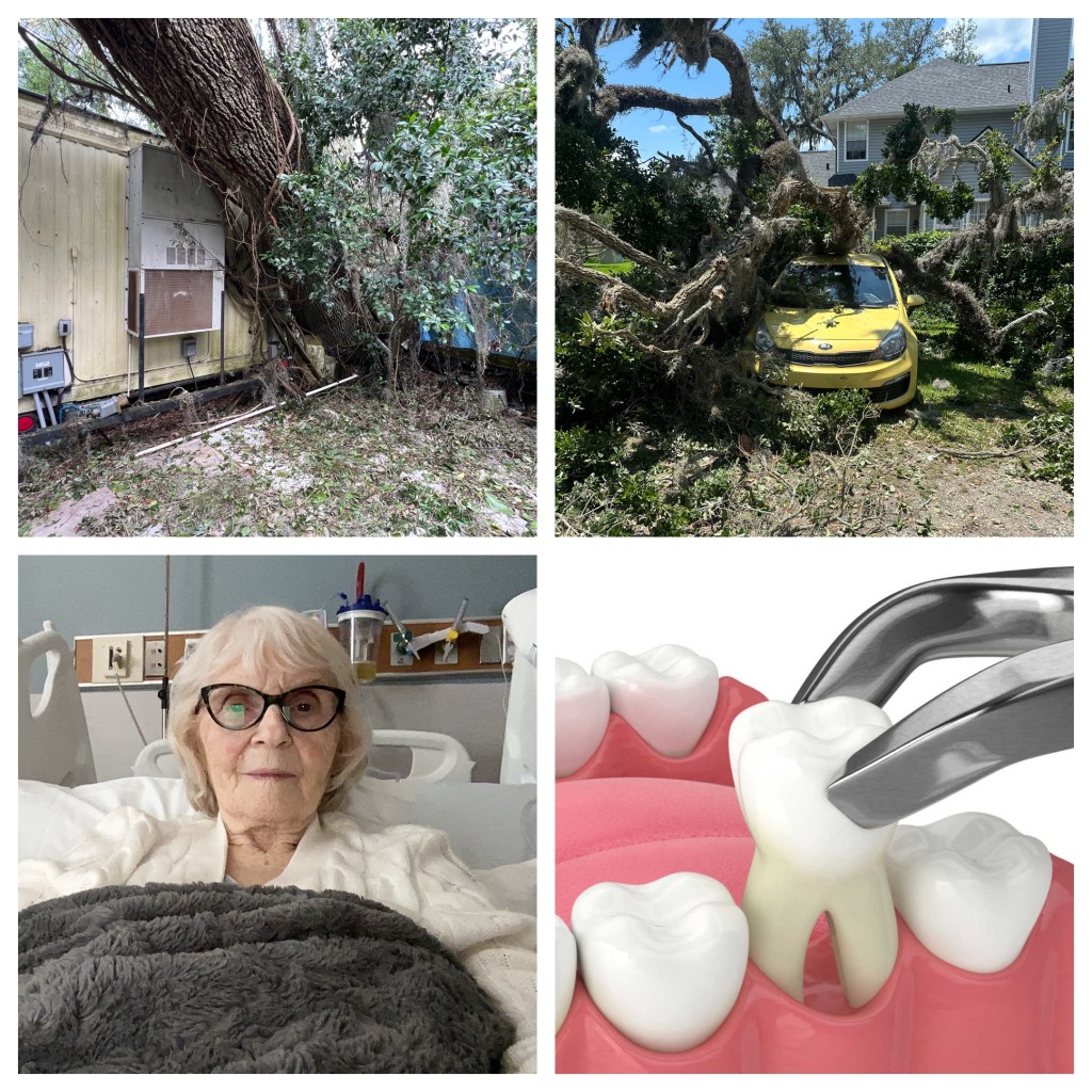Finally, things were getting back to normal, when I went to lunch with my daughter. I had left my car parked in her yard. When we got back, a tree from her neighbor’s yard fell on my car and totaled it.