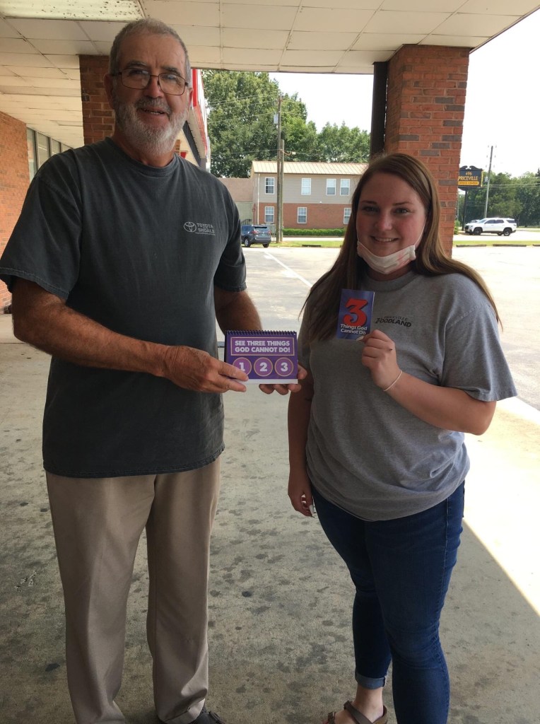 T-Rex Ryan was saved at a recent event. Sometimes people dress in costume for an event to welcome people to the event. This young man came over to the SOS Events booth to get pictures with the workers and he was curious about the “3 Things God Can Not Do”. He was not 100% sure he was going to Heaven. When the ABC’s of salvation was explained he gladly trusted Jesus as his Savior.